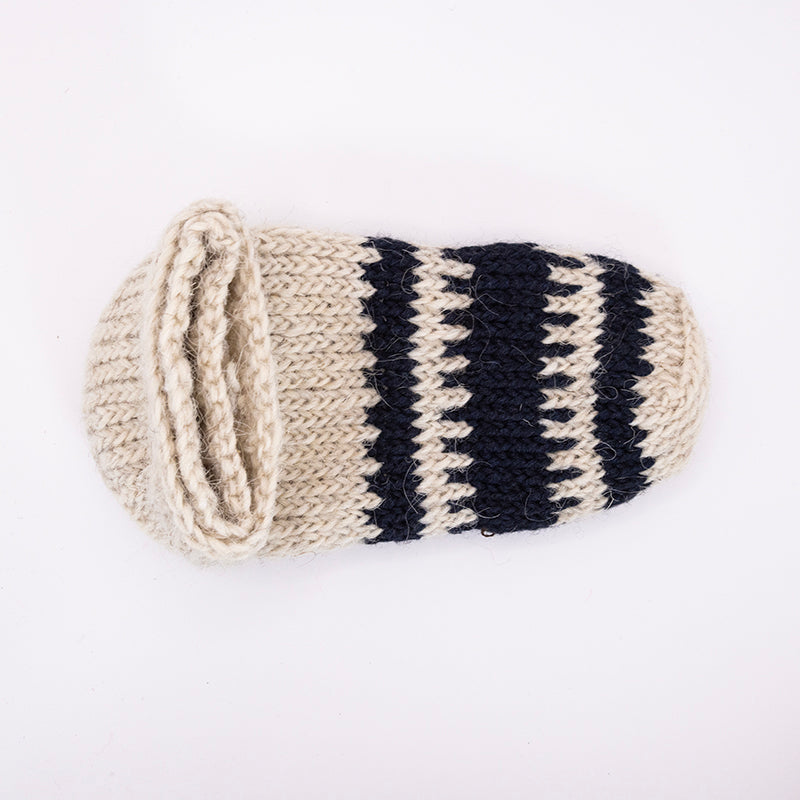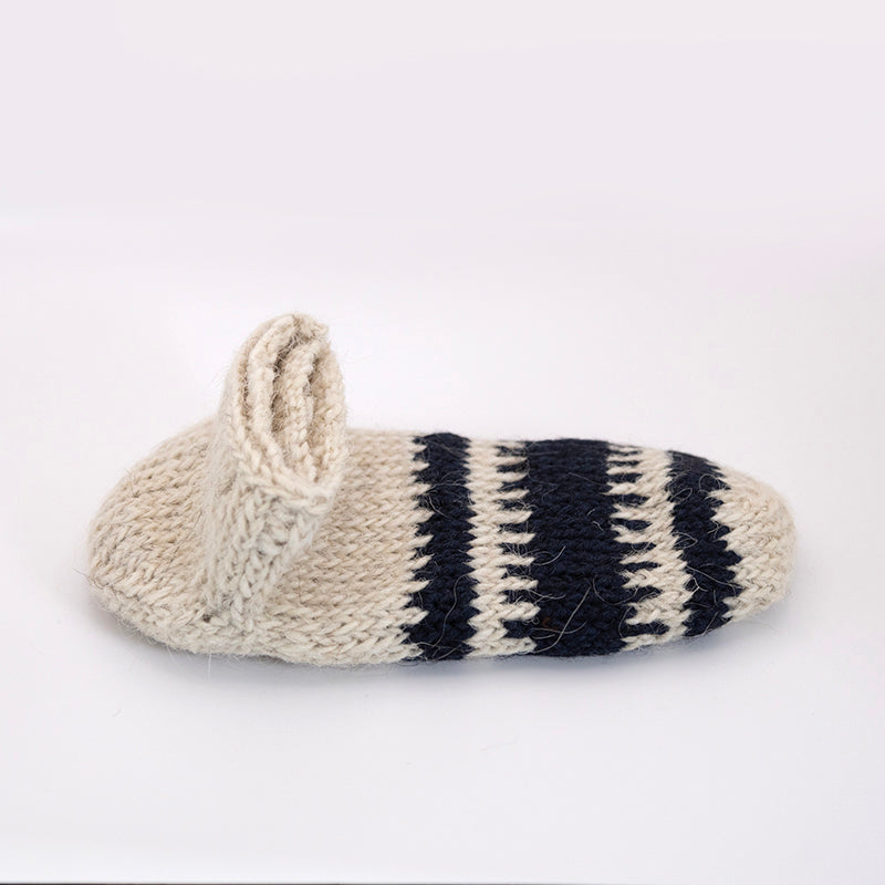 Der weisse Garn ist Wolle. Damit sind diese Priglavke besonders warm, aber auch ein wenig kratzig. Damit es nicht unangenehm ist, streifst du sie deshalb am besten über normale Socken drüber.